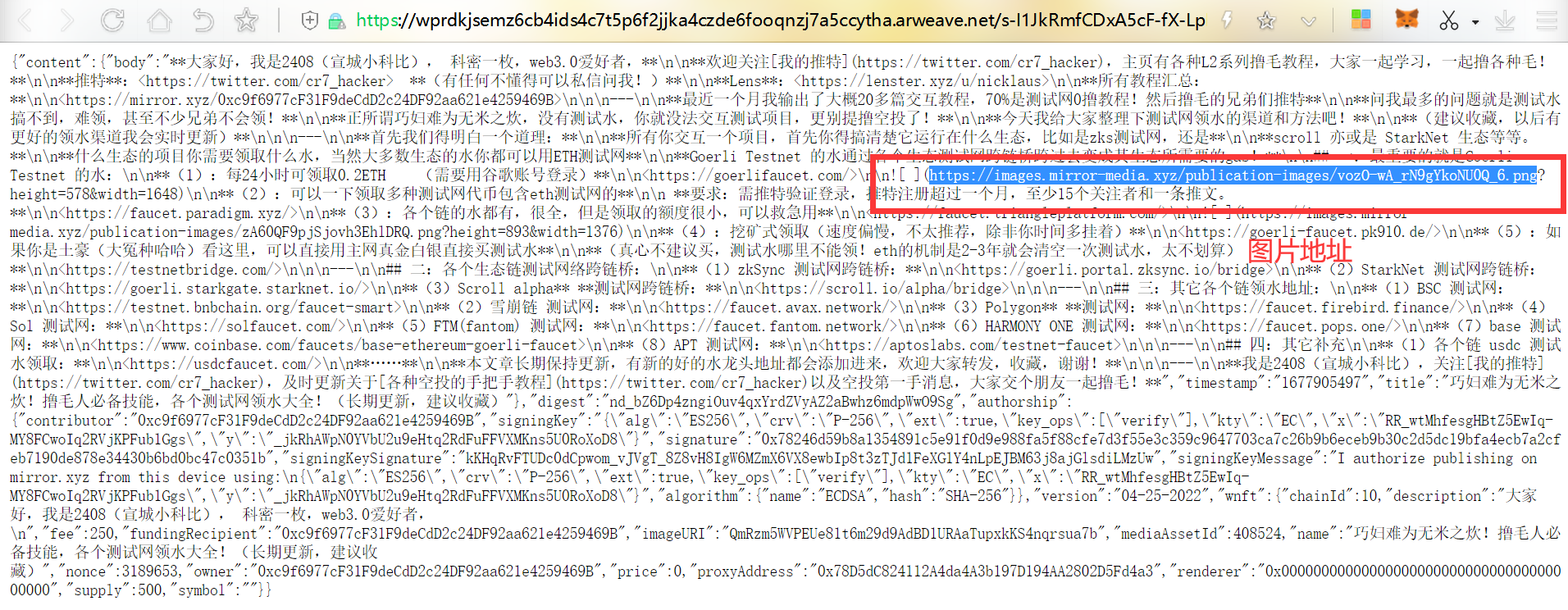 我们可以看到他使用的还是MD的语法(因为这的确好渲染网页),而且图片也被转化为了mirror平台的中心化链接,这其实是有风险的,比如mirror网站关停,图片就无法访问了。